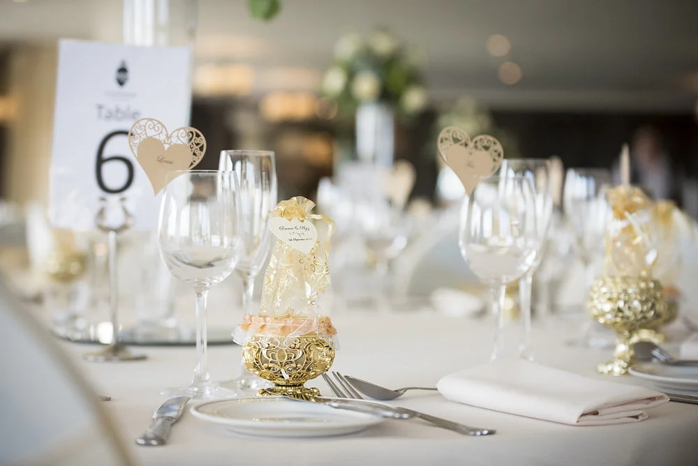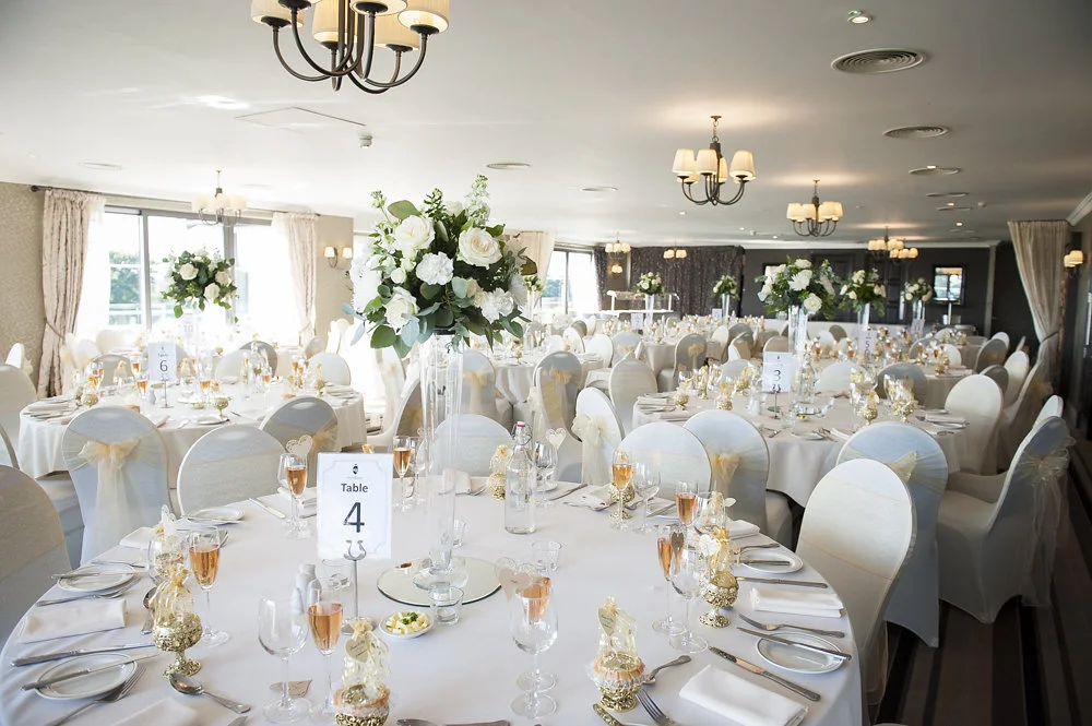 The Nottinghamshire Golf and Country Club is a contemporary venue with amazing panoramic views from the floor to ceiling windows looking out on to the golf course, rolling countryside and the City of Nottingham in the distance. Touches of glamour and modernity suited this diverse couple and their style very well as well as their wedding colours - white, ivory and gold. Reema was a very beautiful bride in her David Tutera Mon Cheri dress and Aziz in his black tuxedo. Following their civil ceremony, the day brought together hints of the couples cultures with Saudi Arabian chocolates, sweets and tea, the scent of oud, traditional Italian sugared almonds bonbonnieres, English roses, changes to traditional Saudi Arabian dress and a legendary speech by Jordanian father of the bride; all done in spectacular style.